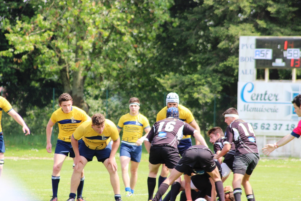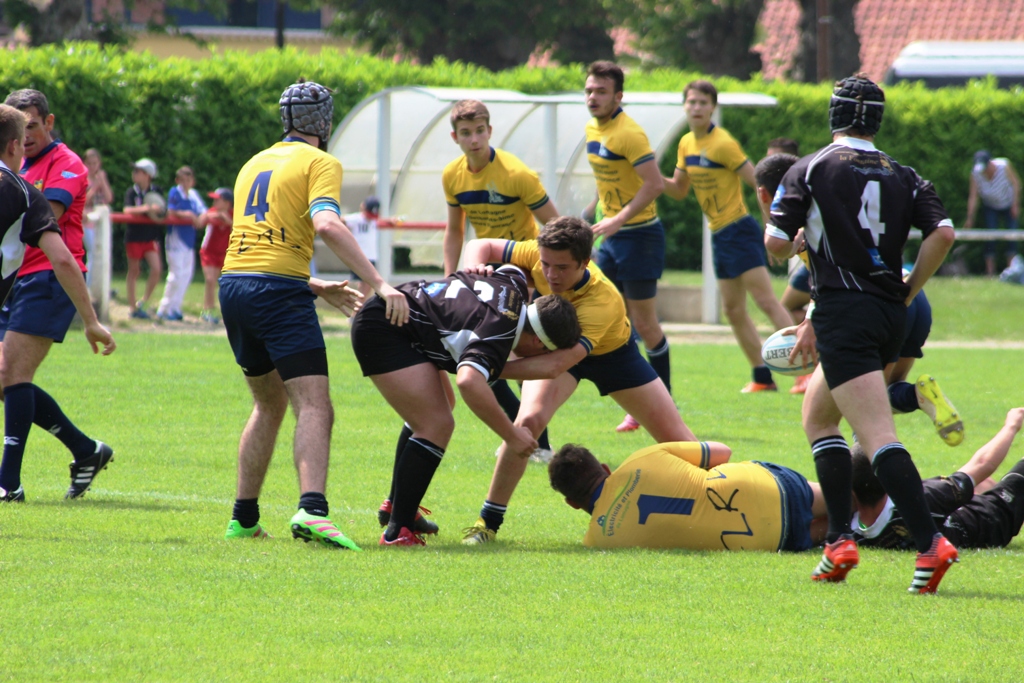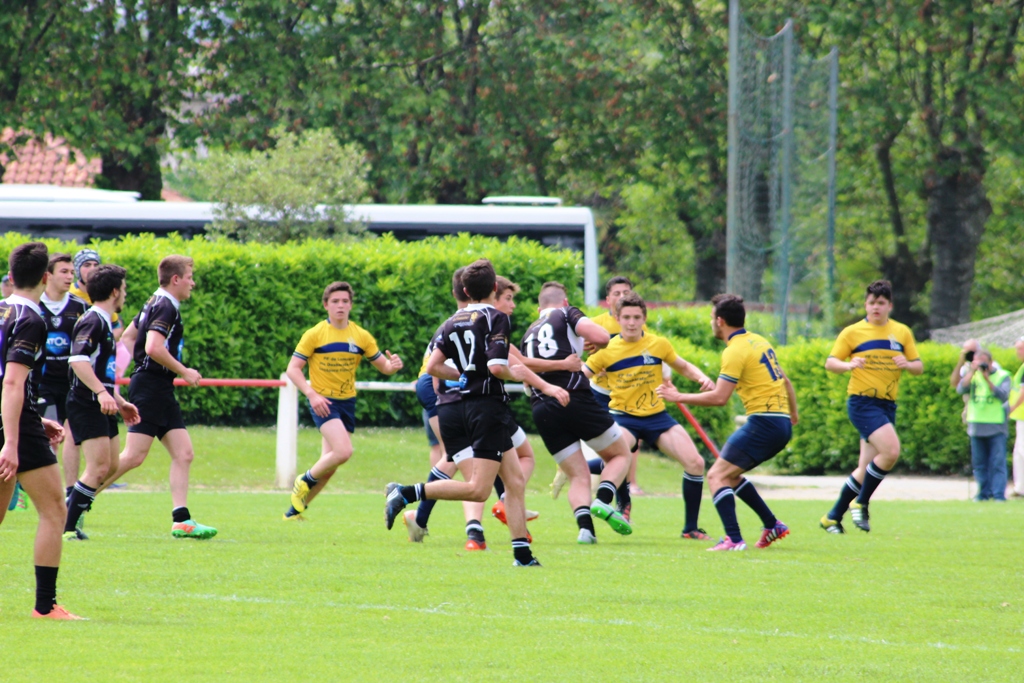 «En avant dans les mains des Pyrénéens…mais l’arbitre leur rend le ballon !!! Grosse faute d’arbitrage et Bagnères marque son premier essai. Mais ce n’est que le début ! Plaquage cathédrale : Pour l’arbitre cela ne vaut sans doute pas un carton rouge, il ne donne en effet au Bagnérais qu’ une biscotte jaune. Qu’à cela ne tienne le tableau d’affichage bien alimenté par Lauray (une transformation et 3 pénalités sur 4 assurées) est à notre avantage et il le restera jusqu’à la fin du temps règlementaire : 13-10, 13-13, 16-13. Nous pensons déjà à savourer notre victoire. Mais l’arbitre ne siffle pas du moins la fin du match. Alors que le match est terminé, il use plutôt de son sifflet pour accorder coup sur coup deux pénalités (41e et 43e) aux Bagnérais qui les ratent. Mais il ne siffle toujours pas la fin du match. C’est sur notre renvoi des 22 que nous allons prendre l’essai Pyrénéen à la 45e. La transformation est ratée mais l’arbitre peut siffler la fin du match (47e) : Bagnères vient de remporter le challenge Dantin 2016. Le Stade Bagnérais est certes une belle équipe, mais cela fait râler d’être injustement privés d’un succès que nous avions obtenu dans le temps règlementaire. L’arbitre nous dira plus tard qu’il avait fait confiance au moment de siffler à son chrono qui affichait 37. Il aurait sans doute du regarder bien avant le tableau d’affichage du stade de Maubourguet lequel affichait à son coup de sifflet 47. Vraiment injuste pour nos gamins».