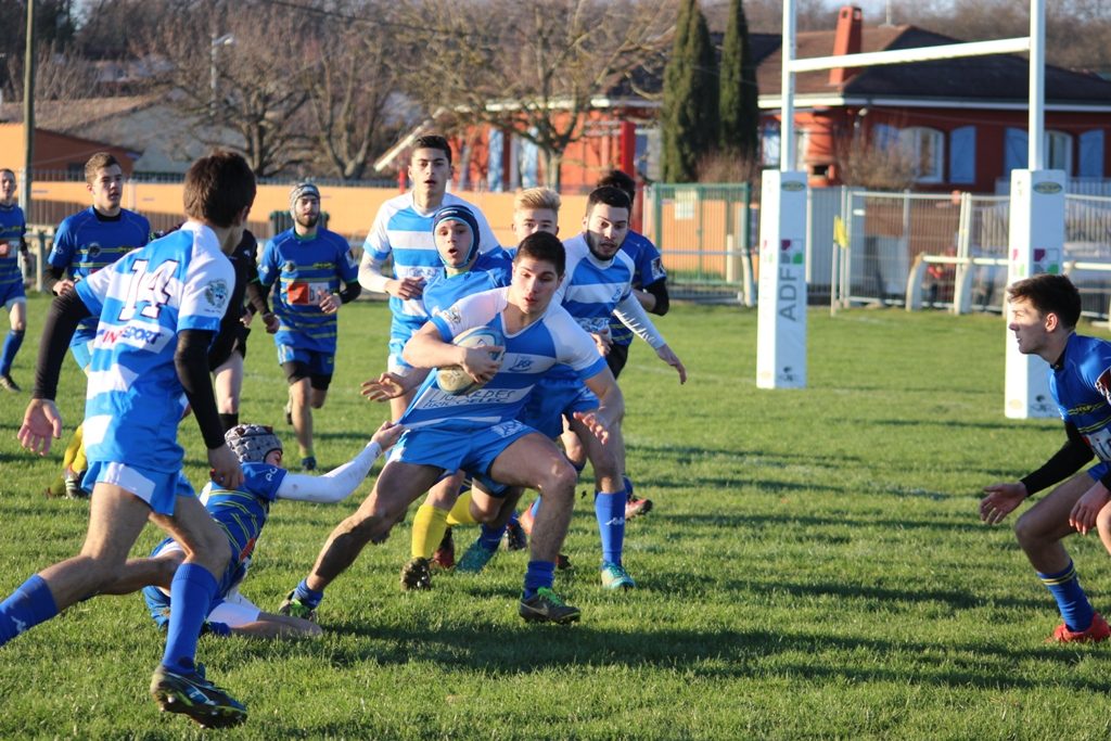 Réaction des joueurs de La Salvetat, efficaces sur le jeu au sol, qui vont nous mettre à la faute et marquer une pénalité. Nos joueurs vont reprendre l’initiative du jeu, privant nos adversaires de ballons.